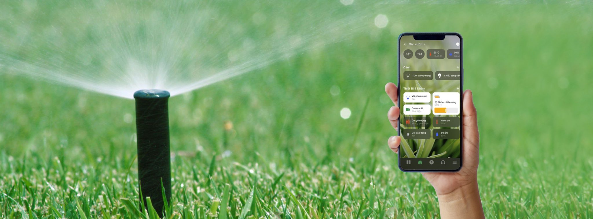 Giải pháp tưới sân vườn tự động cho phép gia chủ có thể điều khiển hệ thống tưới cây, hoa chỉ bằng một chạm thông qua Smartphone hoặc giọng nói