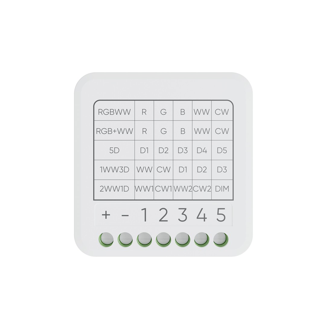 Điện áp hoạt động: 12–24V DC, tương thích với hầu hết LED dây RGB, RGBW, Tunable White, đơn sắc hiện nay.